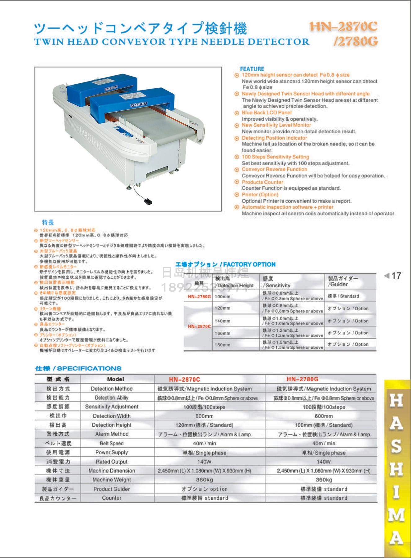 • HN-2870C/2780G雙探頭傳送帶式 羽島HASHIMA檢針機